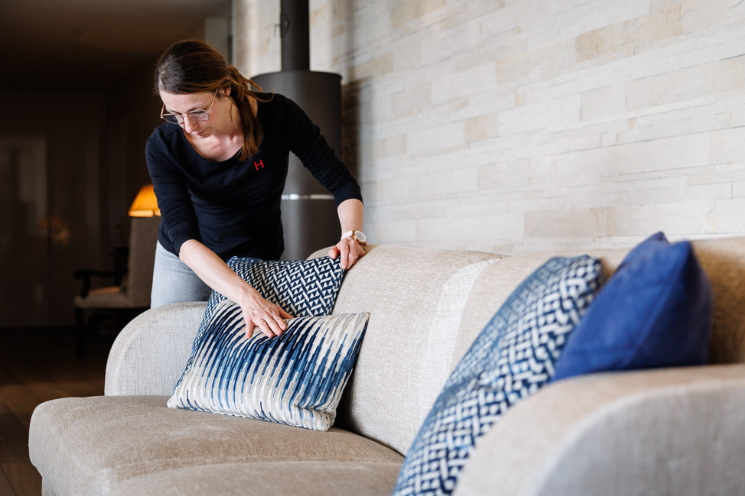 Es trat direkter Schall auf und die Nachhallzeit war zu lang. Auch nach dem Verlegen eines Teppichs und dem Anbringen von Akustikvorhängen entlang der Glaswand war die Situation nicht vollständig verbessert. Daher kommen nun Akustikbilder zum Einsatz. Diese sind in verschiedenen Grössen und Farben erhältlich und tragen zur weiteren Optimierung der Raumakustik bei.