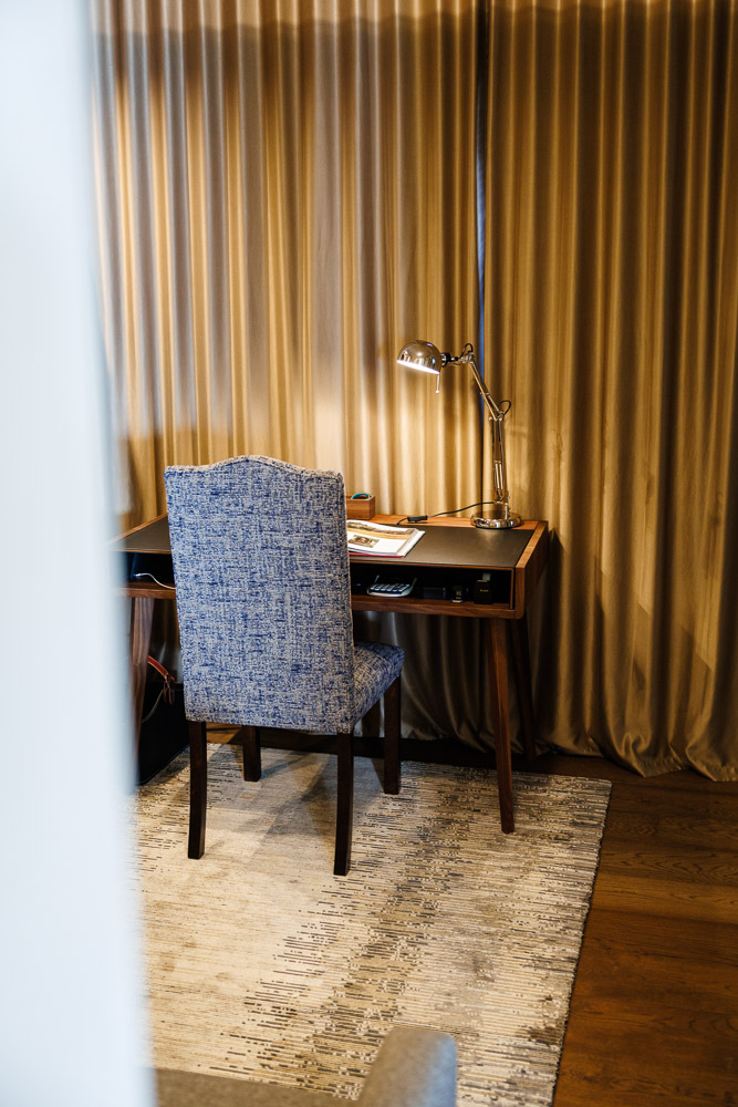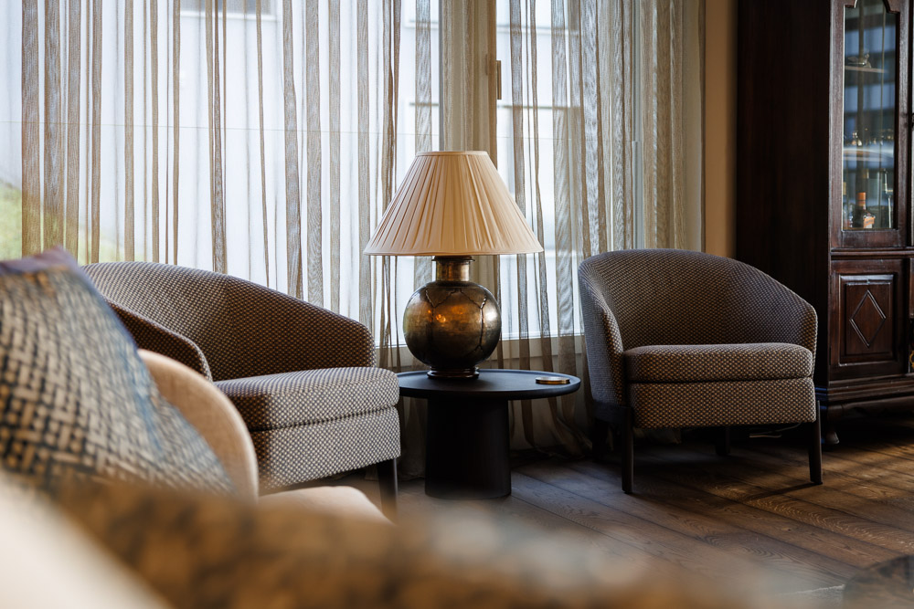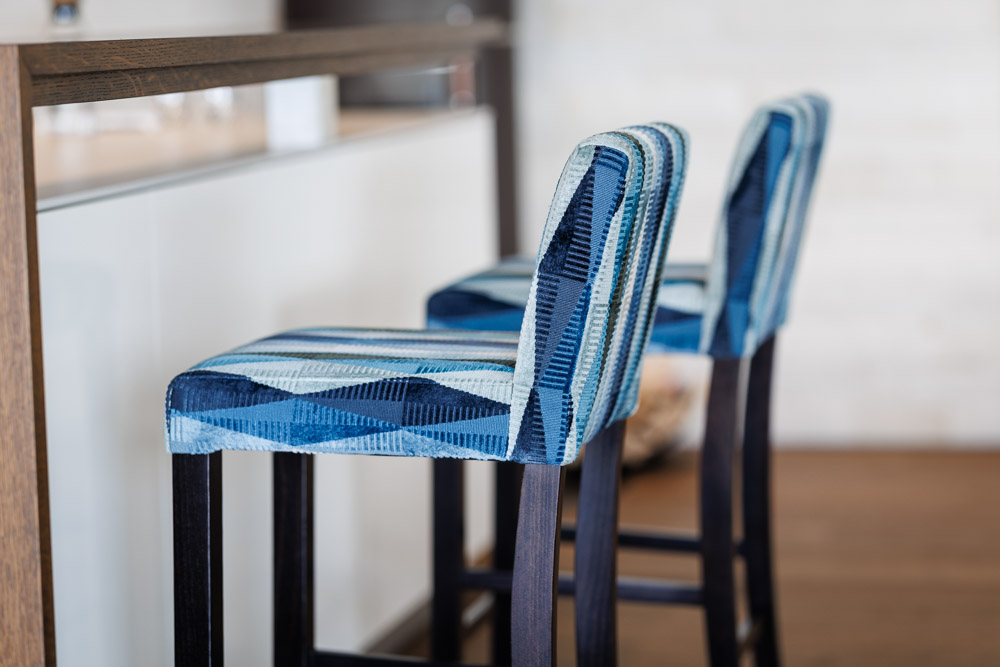 Durch das gewonnene Vertrauen konnten wir das Projekt Schritt für Schritt erweitern: Im Wohnbereich und im Büro ergänzten wir das Gestaltungskonzept mit passenden Auflegeteppichen. Anschliessend folgten neue Sofas, die wir durch massgeschneiderte Zierkissen zu einem echten Blickfang machten. Den finalen Akzent setzten schliesslich die Barhocker, die das Gestaltungskonzept abrundeten und dem Ganzen den letzten Feinschliff gaben.